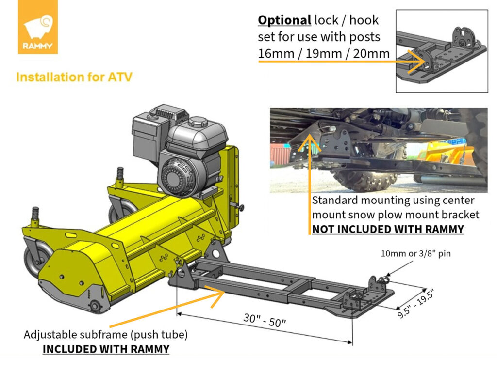 - For best results, we recommend installing the subframe onto your ATV / UTV first, then bolt the Rammy to the subframe while both the vehicle, and the Rammy are on the same level surface.