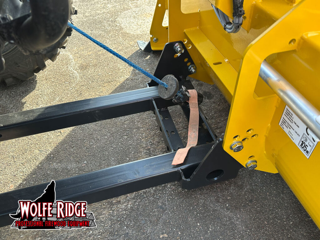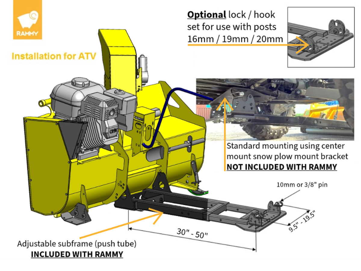 The Snowblower 120 includes a universally adjustable subframe that will attach to almost any snowplow mount bracket, as long as that bracket utilizes 10mm / 3/8″ pins to attach. This subframe is adjustable telescopically in and out, and it has adjustable L bracket ears to fit most plow mounts. This subframe then bolts onto the Rammy attachment. If your machine has 16mm, 19mm, or 20mm mounting posts, you can add the optional Rammy Lock / Hook Set for easy attachment.